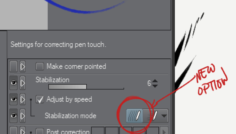 This particular bullet point caught my eye, mostly because Clip Studio Paint’s stabilizer is sort of a sticking point, especially for people coming from (or still using) Paint Tool SAI. SAI’s stabilizer is probably the single thing that keeps people from switching to Clip Studio Paint, and I don’t blame them. Their stabilizer behaviors worlds apart.
