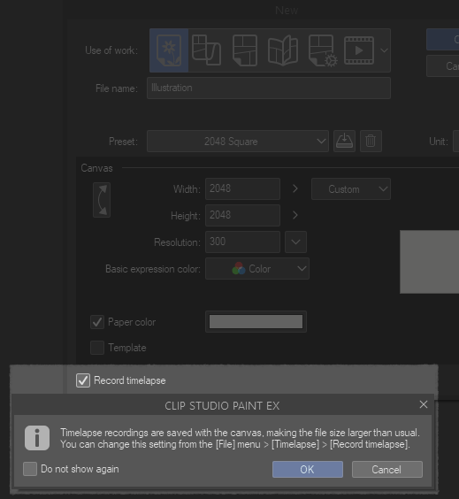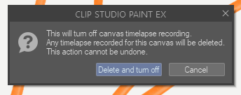 Will recording a timelapse slow down Clip Studio Paint if it’s enabled? From testing it a little, there seems to be no noticeable difference. But I’ve heard people have their laptops and older computers struggle a bit more with it turned on. Your experience probably varies based on your setup.