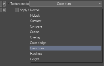 These are similar to how layer blend modes of the same names work, except instead of two layers, they blend the texture with the density of the brush tip.