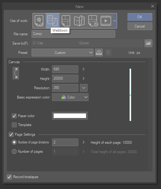 The WEBTOON format is now treated as a first-class citizen with its very own category in the “New” dialog.