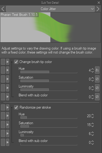 Color Jitter is a whole new brush setting/sub tool detail tab. It absorbed what was previously just “Blend with sub color”, and added all sorts of other controls.