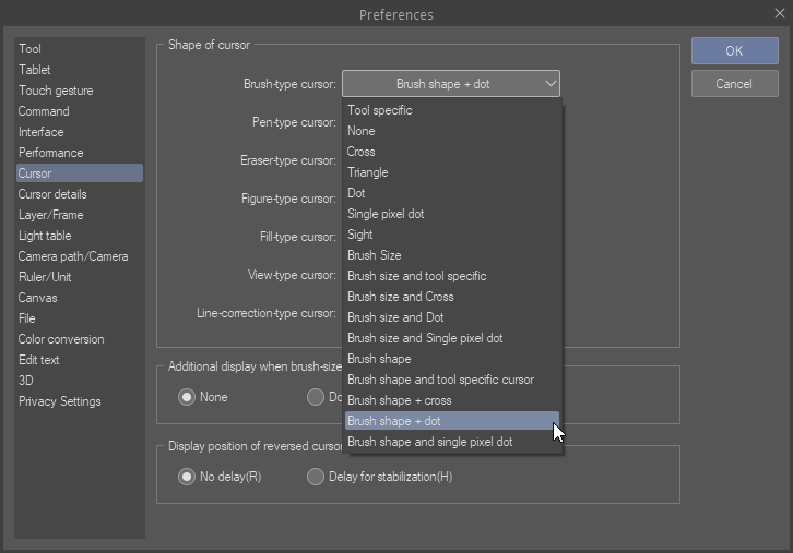 Does it change size with pressure? Does it change thickness with tilt? There are extra options in Preferences under Cursor details category, which allows you to selectively allow it to change its size, rotation and thickness. How the cursor shape changes depends on the brush.